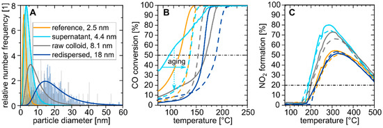 Figure 5C displays the plot of NO oxidation with maximal possible NO2 formation of 100%, the temperature at 20% conversion (T20NO), as well as the maximal conversation of NO. For the NO oxidation, the chemically prepared catalyst showed the strongest aging behavior with an increase in the T20NO of about 11 K. The activity of the small particle size catalyst (supernatant) on the other side was resistant to hydrothermal treatment, displaying the best overall activity of the tested catalysts with a T20NO of about 183 °C after aging. All size-dependent catalytic activities after aging are illustrated in Figure 6. Additionally, the catalytic results from other studies with comparable synthesis methods, reaction gas composition, and catalyst loading are described below and in Figure 6.
