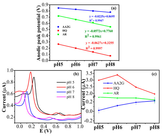 The peak potentials of HQ and AR shifted towards more negative when the pH increased from 5.0 to 8.0, confirming the oxidation of the compounds involved in the proton-transfer process (Figure S5 and Figure 3a). The relationship between H+ and electron is only valid in the acidic solution to neutral (pH 7.0), then becomes almost unchanged in the basic solution for most of the molecule which H+ relates to the redox reaction [27]. The electrochemical reaction becomes more difficult in basic solutions due to the shortage of protons [28]. The slope of the oxidation potential versus pH plot was −62.7 mV⋅pH−1 for HQ and −57.2 mV⋅pH−1 for AR, respectively. Such values were close to the theoretical value of −59 (h/n) mV⋅pH−1 for a redox reaction, where n (number of electrons) is equal to h (number of protons) [29]. However, a smaller effect was observed in AA2G (Figure S5c and Figure 3a). The oxidation potential versus pH (5 to 8) plot exhibited a slope of only −22.5 mV⋅pH−1 for AA2G, implying the oxidation was difficult and became less sensitive to pH due to the lack of proton.