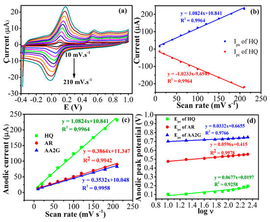 Figure 4. (a) CVs of the Ag@AgCl/Ag2S/CNTs/GCE in phosphate buffer, pH 7 containing HQ (18.2 μM), AR (7.35 μM), and AA2G (5.91 μM) of all analytes at different scan rates: 10 to 210 mV⋅s−1; (b) the peak current versus the scan rate; (c) the anodic peak current versus the scan rate; (d) the anodic peak potential versus the logarithm of the scan rate (X-axis).