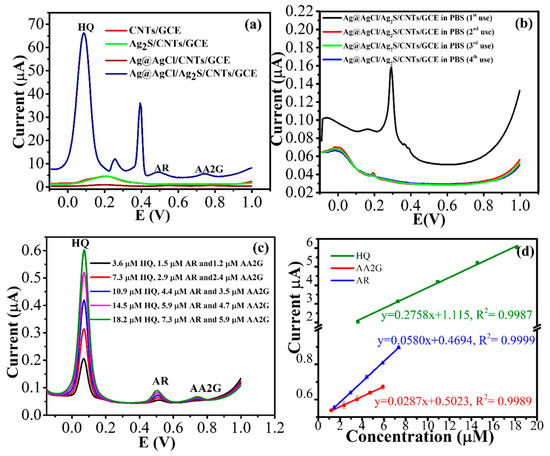 Figure 5. (a) DPVs obtained at CNTs/GCE, Ag2S/CNTs/GCE, Ag@AgCl/CNTs/GCE, and Ag@AgCl/Ag2S/CNTs/GCE in 0.1 M phosphate buffer (pH 7.0) containing 9.1 μM HQ, 3.7 μM AR, and 3.0 μM AA2G; (b) DPVs obtained at the Ag@AgCl/Ag2S/CNTs/GCE in 0.1 M phosphate buffer, pH 7.0 after 10 cycles in the 0.1 M KCl solution; (c) DPVs of the Ag@AgCl/Ag2S/CNTs/GCE vs. Ag/AgCl/KCl upon successive determination of different analytes concentrations in 0.1 M phosphate buffer; (d) Anodic current responses versus the analyte concentration.