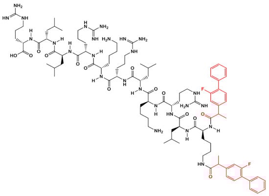 The RMT-driven-FP delivery system was designed by modifying the ApoE-mimicking sequence, H-LRKLRKRLLR-OH, with the addition of a lysine (K) at its amino terminal and coupling two FP molecules to the two exposed amino groups of the lysine. The complex AEP-lysine-FP delivery system (AEP-K-FP) (chemical formula: C96H152 F2N26O14, molecular weight (MW): 1932 Da (Figure 1) was obtained by a solid phase peptide synthesis (SPPS) method, where the yield of the reaction was enhanced by the aid of microwave synthesiser Biotage Initiator (Hengoed, UK) [41]. All amino acids, Rink amide, and Tenta gel used were obtained from Merck Ltd. (Southampton, UK) (purity 98%), and other solvents of high-performance liquid chromatography (HPLC) grade were purchased from Fisher Scientific (Loughborough UK). The assembly started on a Tenta gel NH2 resin (0.5 g) using 0.4 mmol of phenylalanine (Fmoc-Phe-OH) and a sequence of Fmoc-Leu-OH, Fmoc-Arg-OH, Fmoc-Lys(Boc)-OH, Fmoc-Leu-OH, Fmoc-Arg-OH, Fmoc-Lys(Boc)-OH, Fmoc-Arg-OH, Fmoc-Leu-OH, Fmoc-Leu-OH, Fmoc-Arg-OH, consecutively followed by the coupling of lysine (Fmoc-Lys(Fmoc)-OH) and FP (Sigma Aldrich, Gillingham, UK) [40].
