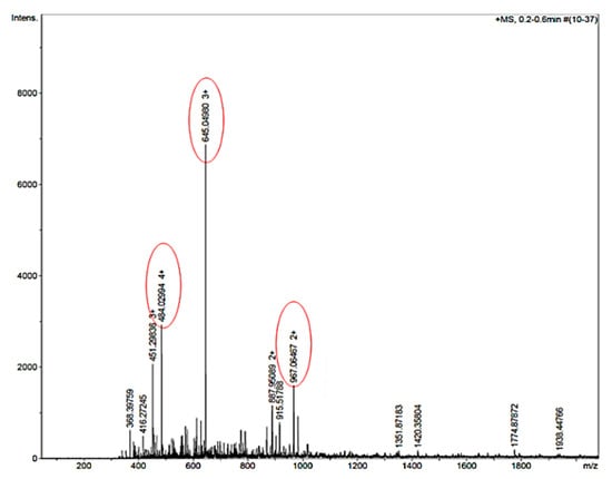 Mass spectra of AEP-K-FP shows the dominant peak (645 with triple positive charge) of intensity 6.9 × 103 refers to the theoretical MW (m/z = (1932 + 1.008 × 3)/3). Alternatively, the peaks 484 with quaternary charge at 3 × 103 intensity and 967 with double charge at 1.7 × 103 intensity represent the related ions of AEP-K-FP (m/z = (1932 + 1.008 × 4)/4 and m/z = (1932 + 1.008 × 2)/2, respectively.