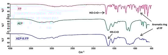 FTIR spectra of drug (FP) alone, peptide (AEP), and AEP-K-FP. The spectra show shifting peaks due to the formation of peptide linkages at 3200 and 1646 cm−1. The FP spectrum shows a strong carbonyl band at 1700 cm−1, which represents its COOH functional group that disappears in the AEP-K-FP spectrum due to amide linkage formation. In addition to the appearance of a new peak at 782 cm−1, it corresponds to the aromatic ring of FP with its C=C peak at 910 cm−1 in the AEP-K-FP spectrum, which confirms the FP attachment to the peptide.