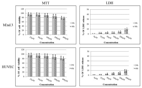 An MTT assay was carried out on confluent bEnd.3 and HUVEC cells after 24 and 48 h of treatment with increasing concentrations of the AEP-K-FP. The results showed no reduction in cell metabolic activity by giving values more than 70% in relation to the control untreated cells (Figure 4), and all values were within acceptable cytotoxic range (International-Standards 2009). The results suggest that AEP-K-FP was not toxic to either cell phenotypes, even at the highest concentration used (400 µM) they were 78.7% and 76.8% in bEnd.3 at 24 and 48 h, respectively, whereas for those with HUVEC, they were 83% and 80.2% after 24 and 48 h of treatment, respectively. In addition, the statistical analysis showed no significant differences (P > 0.05) between the corresponding concentrations after 24 or 48 h of exposure.