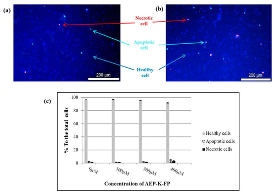 Examples of microscopic pictures after HPI staining. (a) Untreated cells (0 µM). (b) AEP-K-FP (400 µM). The blue cells represent the healthy living cells while the bright blue refers to apoptotic cells, and the red is necrotic cells. (c) The percentage of healthy, apoptotic, and necrotic cells to the total number of cells in each field with no significant differences from the control (P > 0.05). Data expressed as mean ± SD of n = 6.