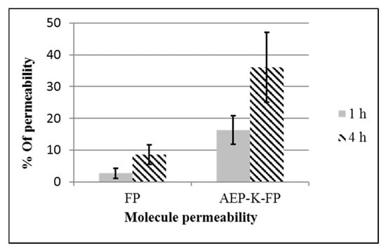 The percentage of the AEP-K-FP permeated across this model increased more than 6 times (16.3%) after 1 h, and 4 times (35.9%) after 4 h with significant differences (P < 0.001) from that of free-FP levels, which did not exceed 2.7% and 8.5% of the applied concentration after 1 h and 4 h, respectively (Figure 7). It is worth mentioning that the AEP-K-FP has 2 additional moles of drug, hence this can increase the amount of drug that is released upon dissociation of the linkage.