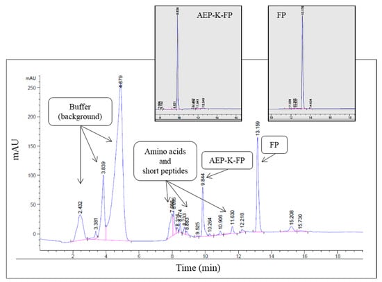 HPLC analysis of AEP-K-FP. The inserts show the elution of the initial AEP-K-FP and free FP.