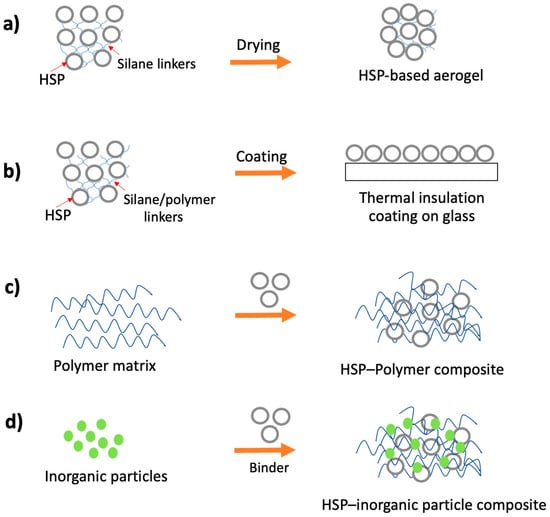 Schematic illustration of common existing and possible HSP-based thermal insulation materials. (a) an aerogel made by crosslinking HSPs with silane linkers, (b) a coating made by incorporating HSPs in polymer matrices, (c) thermal insulation material based on polymer–HSPs composite, (d) A hybrid insulation material made by mixing HSPs with other inorganic particles.