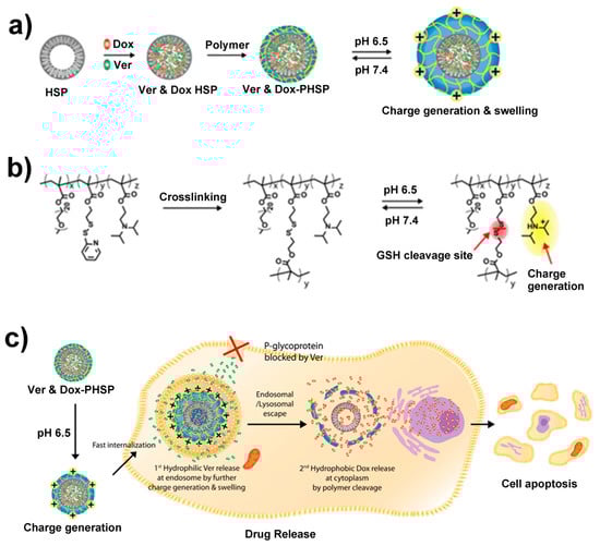 (a) Scheme for preparation of drug-loaded PEG(polyethylene glycol)–PDS(pyridine disulfide)–DPA{2-(diisopropylamino) ethyl methacrylate} copolymer-coated HSP (PHSP), (b) disulfide crosslinking, and pH-dependent cationic charge reversal by the protonation of the diisopropylamino group. (c) Schematic illustration of the cellular uptake, endosomal escape, and glutathione (GSH)-mediated drug release. Under tumoral acidic conditions (pH 6.5), positive charge reversal results in a fast cellular uptake. Further increase of the positive charge of the polymer in the endosome (pH 5.0–5.5) induces the swelling of the polymer, followed by the release of hydrophilic Ver, facilitating the endosomal escape of the nanoparticles. In the presence of intracellular GSH, the second drug, hydrophobic Dox, is released. Adapted from [59] with permission from Springer Nature (2017).