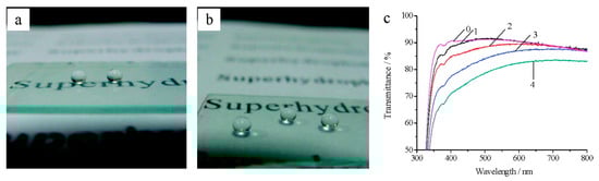 Digital photos of glass slides with superhydrophobic coatings prepared by dip-coating the APTS-modified HSPs: (a) APTS 0.70 wt % and (b) APTS 0.90 wt %. (c) Transmission spectra of coatings on glass slides: (0) bare glass slide and (1−4) slides prepared by dip-coating the 0.30 wt %, 0.50 wt %, 0.70 wt %, and 0.90 wt % APTS sols. Adapted with permission from [107]. Copyright (2012) American Chemical Society.