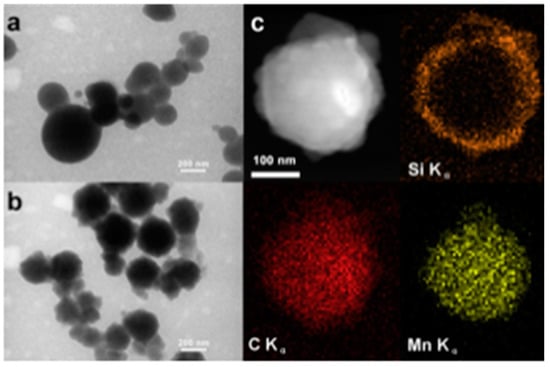 (a) TEM image of PAA-Mn aggregate particles before silica coating, (b) TEM image of PAA-Mn aggregate particles after silica coating, (c) STEM image and Si, C, and Mn EDX mapping images of a single particle after silica coating. Reproduced from [116] with permission from Elsevier (2013).
