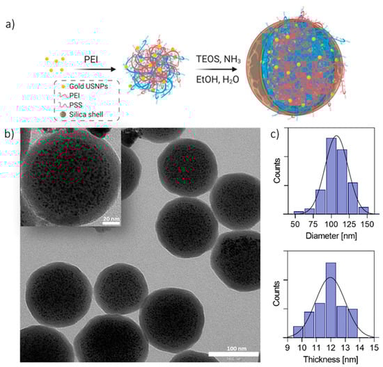 (a) Scheme for the synthesis of dragon fruit nano-architectures (dNAs). Gold seeds are synthesized in the presence of poly(sodium 4-styrenesulfonate) (PSS) and assembled in controlled aggregates with polyethyleneimine (PEI). The aggregates are employed as templates for the formation of silica nanocapsules. (b) Typical transmission electron microscopy (TEM) image of dNAs. Scale bar: 100 nm. Inset: zoom on one dNA. Scale bar: 20 nm. (c) Size diameter distribution and silica shell thickness histograms of dNAs, performed on 150 nanoparticles.
