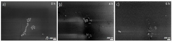 Indeed, the X-ray attenuation properties of nanostructured gold may avoid the limitations of the conventional agents in radio-oncology, among which are toxicity, osmolality, and viscosity [5,25,27]. One of the most important features of dNAs is their faster degradation compared with NAs in biological fluids, another factor probably ascribable to the reduced silica capsule thickness, which takes less time to degrade (Figure 2). It is worth remembering that the (bio)degradation of NAs has already been investigated and results in biosafe building blocks (silicic acid, biodegradable polymers, and glutathione-coated USNPs), which are metabolized or excreted by organisms [3,9,10,14]. The dNA degradation assessment was performed by SEM imaging of samples incubated in 20% human serum at 37 °C (Figure 2). After a few hours of incubation, the nano-architectures started losing their spherical shape, while after 6 h, no more intact dNAs were observed, even if some background silica structures on the silicon wafer could be found. The background material was probably due to the silica re-condensation in the close experimental set-up.