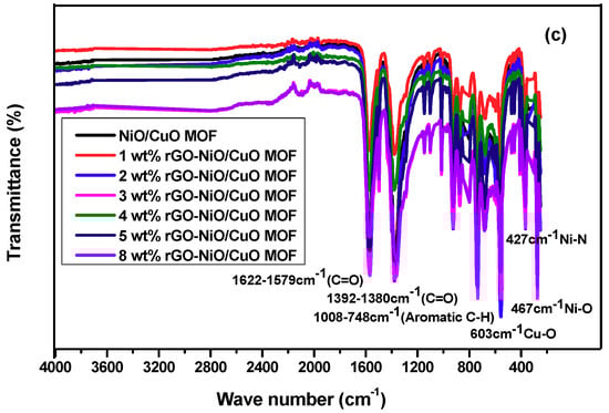 The presence of functional groups in NiO/CuO MOF and its composites with rGO were also investigated through FTIR. In Figure 1c, the sharp peak at 1622–1579 cm−1 and 1392–1380 cm−1 indicate the C=O asymmetric and symmetric stretching in all prepared catalysts. The absence of a strong absorption peak at around 1715–1680 cm−1 confirms the deprotonation of –COOH group in benzene dicarboxylic acid. Furthermore, the peak at 1008–748 cm−1 indicates the presence of aromatic C–H in both in plane and out of plane bending vibrations in benzene dicarboxylic acid linkers and peaks at 603 cm−1, 441–550 cm−1, 427 cm−1, 467 cm−1 illustrate Cu–O, Cu–N, Ni–N and Ni–O stretching vibrations, respectively [39].