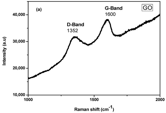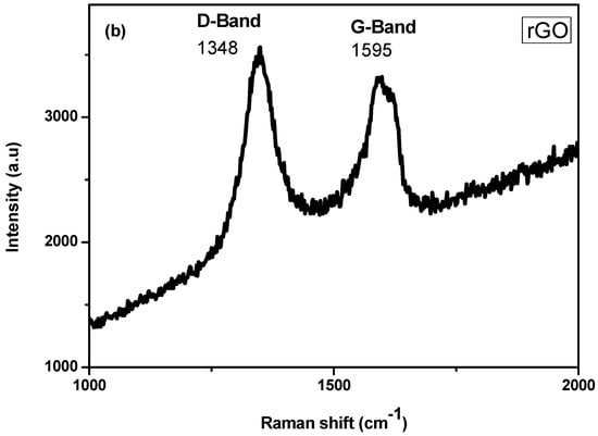 Furthermore, reduced graphene oxide Figure 2b also shows two bands. Because of the defects present in rGO, D band appears at 1348 cm−1, while G band of rGO displayed at about 1595 cm−1. This G band appears due to stretching vibration of sp2 hybridized carbon present in C=C in the reduced graphene layer. The value of intensity ratios (ID/IG) is about 1.42 in the case of the reduced graphene oxide layer which is complicated by the insufficient recovery of graphene structure and presence of sp3 defects in the structure [40,41].