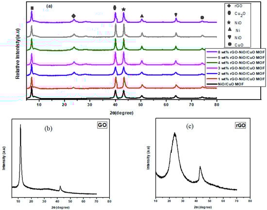 Powder XRD of (a) NiO/CuO MOF, 1 wt% rGO–NiO/CuO MOF, 2 wt% rGO–NiO/CuO MOF, 3 wt% rGO–NiO/CuO MOF, 4 wt% rGO–NiO/CuO MOF, 5 wt% rGO–NiO/CuO MOF and 8 wt% rGO–NiO/CuO MOF (b) graphene oxide (c) reduced graphene oxide.