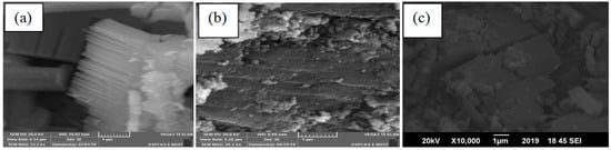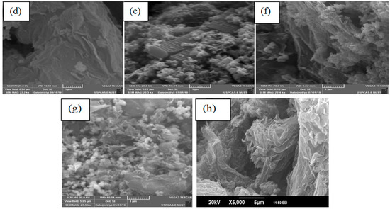 All the synthesized catalysts’ morphologies were also studied through SEM (scanning electron microscopy) analysis illustrated in Figure 4. SEM images show clear incorporation of NiO/CuO MOF nanosheets stacked over each other within the wrinkled sheets of rGO [48,49]. While EDX results in Table 1 depicts the presence of nickel and copper along with carbon and oxygen. The gradual increase in carbon content reveals that composites were successfully synthesized without any impurity.
