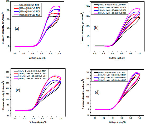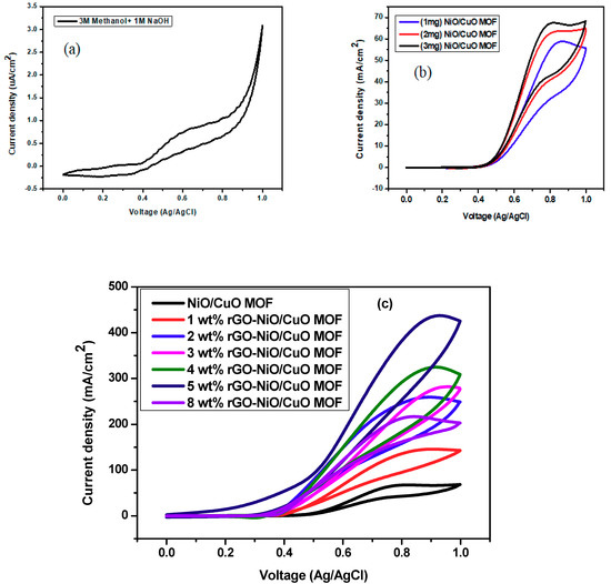 Electrochemical activity of NiO/CuO MOF and rGO–NiO/CuO MOF composites was tested by cyclic voltammetry in 3 M CH3OH and 1 M NaOH at a scan rate of 50 mV/s for methanol oxidation reaction. Current density of bare electrode was 0.81 µA/cm2 as shown in Figure 5a. Concentration studies for NiO/CuO MOF were carried out at various catalyst loadings such as 1.0 mg, 2.0 mg and 3.0 mg as illustrated in Figure 5b, which clearly shows the gradual increase in current density with more active sites available for methanol oxidation reaction ultimately enhancing the catalytic activity [50]. Gradual increase in peak current density with increased concentration of rGO in comparison to pure NiO/CuO MOF can be shown in Figure 5c. This means that rGO shows active performance towards methanol oxidation reaction [51]. This characteristic is important for its electrochemical application in fuel cells [50]. The improved electro catalytic activity of NiO/CuO MOF with rGO composite is due to their synergic effect. Presence of rGO increased the surface area of the catalyst and also supported their charge transfer properties [42]. Pure NiO/CuO MOF shows current density of 67.48 mA/cm2 at scan rate 50 mV/s. NiO/CuO MOF with 5 wt% rGO shows a maximum current density at 50 mV/s of 437.28 mA/cm2 at 0.9 V. With the gradual increase in amount of rGO, peak current density rises to the following levels: 145.5 mA/cm2 for 1 wt%, 259 mA/cm2 for 2 wt%, 264.57 mA/cm2 for 3 wt%, and 324 mA/cm2 for 4 wt% at a scan rate of 50 mV/s. The catalyst with 5 wt% rGO shows maximum response as compared to other 1–4, 8 wt% and NiO/CuO MOF as shown in Table 2. This increased response of 5 wt% rGO composites clearly shows that it lowers the activation energy required for methanol oxidation reaction.