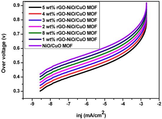 Reaction kinetics of the catalytic process can be determined by Tafel plots, by comparing over potential with current density as shown in Figure 7. It is an appropriate method for the evaluation of methanol oxidation reaction (MOR) activity. Over potential is calculated by using the formula (E–Eo) [58]. Among all the composites (i.e., 1–5 wt% and 8 wt% rGO–NiO/CuO MOF and NiO/CuO MOF), 5 wt% rGO–NiO/CuO MOF shows the lowest over potential value; this suggests that the inclusion of rGO may not only increase the catalyst surface area but it may also make the accessibility of reactant toward electrode easier and consequently, it apprehends more ions and exhibits higher activity for the oxidation of methanol [59,60]. However, the over potential value of 8 wt% rGO–NiO/CuO MOF is low from 1 wt% and NiO/CuO MOF and high from 2, 3, 4, 5 wt%; these results illustrate a good correspondence with the CV results as they show low current density because of agglomeration of rGO sheets that results in lower surface area and may hinder the ions from reaching the electrode surface.