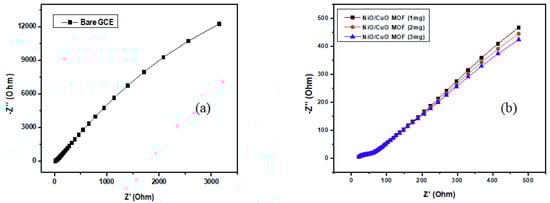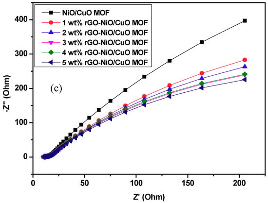 Furthermore, rGO has a significant impact on impedance as incorporation of rGO into NiO/CuO MOF reduces the charge transfer resistance as shown in Figure 8c. Among all composites and MOF, 5 wt% rGO–NiO/CuO MOF shows the lowest Rct value. Moreover, the entire results showed complete compliance with the results of Cyclic Voltammetry [63].