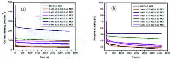 The stability of electro catalysts was observed through chronoamperometry by using the same three-electrode system at a constant voltage of 0.9 V in 3M methanol and 1M NaOH solution as shown is Figure 9a. In the first 60 s there is an initial drop in current density observed mainly because of intermediate reactions i.e., (Co, CHO, COOH) adsorption on catalysts’ surface, after which the current density decreases steadily and reaches a quasi-stationary state until 3600 s. Catalytic sites were vacant at the start of the reaction and were freely available for coverage of methanol but with the passage of time an equilibrium layer of methanol developed on the surface which slowed down the process [64,65]. After applying the set potential for 3600 s, the maximum current density value is (469.4 mA/cm2) for 5 wt% rGO-NiO/CuO MOF, followed by 4 wt% rGO–NiO/CuO MOF (306.2 mA/cm2), 3 wt% rGO–NiO/CuO MOF (207.2 mA/cm2), 2 wt% rGO–NiO/CuO MOF (203.2 mA/cm2), 1 wt% rGO–NiO/CuO MOF (136 mA/cm2) and NiO/CuO MOF (106.5 mA/cm2). While stability of 8 wt% rGO–NiO/CuO MOF was also investigated, this shows a current density value (199 mA/cm2) which is comparable with its CV results.