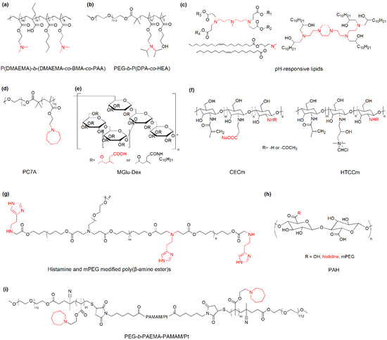 Representative materials with pH-dependent protonation/ionization for cancer immunotherapy. (a) P(DMAEMA)-b-(DMAEMA-co-BMA-co-PAA): poly(dimethylaminoethyl methacrylate)-b-(dimethylaminoethyl methacrylate-co-butyl methacrylate-co-propylacrylic acid); (b) PEG-b-P(DPA-co-HEA): poly(ethylene glycol)-b-poly(diisopropanol amino ethyl methacrylate-co-hydroxyethyl methacrylate); (c) pH-responsive lipids; (d) PC7A: poly(ethylene glycol)-b-poly(2-(hexamethyleneimino)ethyl methacrylate); (e) MGlu-Dex: dextran derivatives having 3-methylglutarylated residues; (f) CECm: amphoteric methacrylamide N-carboxyethyl chitosan; HTCCm: methacrylamide N-(2-hydroxy)propyl-3-trmethylammonium chitosan chloride; (g) histamine and mPEG modified poly(β-amino ester)s; (h) PAH: PEG-histidine modified alginate; and (i) PEG-b-PAEMA-PAMAM/Pt: platinum (Pt)-prodrug conjugated and poly(ethylene glycol)-b-poly(2-azepane ethyl methacrylate)-modified polyamidoamine. The key pH-sensitive groups are indicated in red.