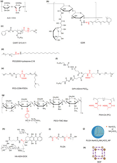 Representative materials with acid-labile bond cleavage or degradation for cancer immunotherapy. (a) ALG = OVA: ovalbumin-conjugated alginate; (b) GDR: galactosyl dextran-retinal conjugates; (c) CART D13:A11: charge-altering releasable transporter with 13 carbonate repeating units and 11 amino ester repeating units; (d) PEG2000-hydrazone-C18: conjugates of polyethylene glycol (molecular weight of 2000) and stearic hydrazide; (e) PEG-CDM-PDEA: conjugates of PEG and poly(2-(diethylamino) ethyl methacrylate with 2-propionic-3-methylmaleic anhydride linkers; (f) DiPt-ASlink-PEG2k: conjugates of PEG2000 and hexadecyl-oxaliplatin(IV) with 2-propionic-3-methylmaleic anhydride linkers; (g) PEG = TMC-Man: PEG and mannose doubly modified trimethyl chitosan; PAH-Cit (PC): citraconic anhydride-grafted poly (allylamine hydrochloride); (h) HA-ADH-DOX: conjugates of hyaluronic acid and doxorubicin with hydrazine linkers; (i) PLGA: poly(lactic-co-glycolic acid); (j) PLGA-NaHCO3/NH4HCO3 NP: NaHCO3 or NH4HCO3-encapsulated PLGA nanoparticle; and (k) MOF: Metal-organic framework. The acid-labile groups are indicated in red.