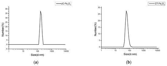 Figure 1. DLS curve of (a) JC-Fe3O4 nanoparticle; (b) CT-Fe3O4 nanoparticle.