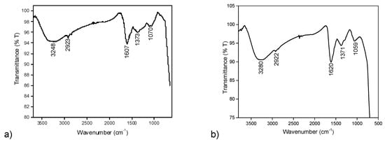 Next the FTIR analysis was performed to prove the presence of JC latex as the capping material for the synthesized MNPs. Synthesized JC-Fe3O4 NPs showed a strong absorption band at 1607 cm−1 (stretching vibration of C–N group), which was attributed to the binding of JC latex as the capping agent since this peak was also observed to be a significant peak in case of dried JC latex powder at 1618 cm−1 [37]. Other significant FTIR peaks showed the bands at 3248 cm−1 (N–H stretching for amides), 2923 cm−1 (secondary amine), 1373 cm−1 (–CO–stretching), and 1070 cm−1 (O–H stretching), which clearly proved the presence of protein/peptide on the nanoparticle binding surface. This data also fitted well with the previously reported Jatropha curcas extract capped nanoparticles [53] (Figure 3a).