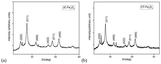 Figure 4. X-ray diffractometer patterns of MNPs (a) JC-Fe3O4 and (b) CT-Fe3O4.