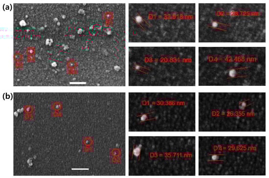 Figure 5. FE-SEM images showing the morphology of (a) JC-Fe3O4 and (b) CT-Fe3O4 NPs; Left: Single nanoparticles are marked with red circles. Right: Magnification of each single nanoparticle with the measured diameter (scale bar: 200 nm).