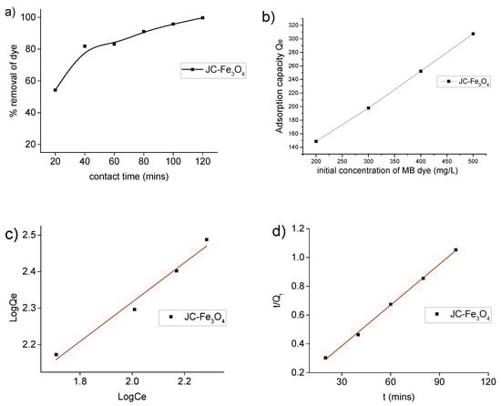 Figure 6. Plot of (a) % removal of MB dye with contact time; (b) adsorption capacity (Qe) of MB dye with concentration; (c) Freundlich adsorption isotherm model (Log Qe vs Log Ce); (d) Pseudo-second-order kinetic model for adsorption t/Qt vs. t (mins) of JC-Fe3O4 NPs.
