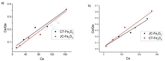 Figure 7. Langmuir isotherm plot for the removal of (a) Co2+ ions and (b) Cu2+ ions by JC-Fe3O4 and CT-Fe3O4 NPs.