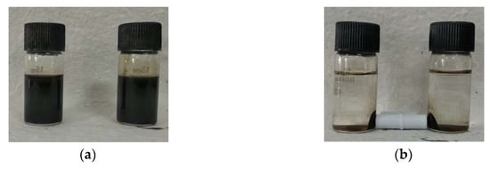 Figure 8. Respective MNPs solutions; (a) before separation; (b) after using a magnetic bar. VSM analysis of magnetite nanoparticles: (c) JC-Fe3O4 and (d) CT-Fe3O4 NPs.