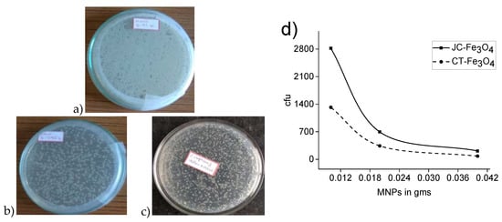 Figure 9. Images of bacterial culture: (a) untreated pond water; (b) with CT-Fe3O4; (c) with JC-Fe3O4; (d) bacterial concentration with respect to amount of MNPs.