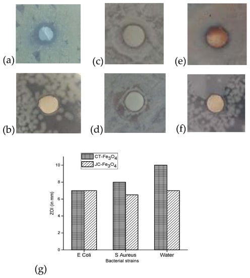 Figure 10. ZOI against water-born Gram-positive bacteria using (a) CT-Fe3O4 NPs (10 mm diameter) and (b) JC-Fe3O4 NPs (7 mm diameter); ZOI against E. coli (Gram-negative bacteria) (c) CT-Fe3O4 NPs (7 mm diameter)and (d) JC-Fe3O4 NPs (7 mm diameter); ZOI against S. aureus (Gram-positive bacteria) (e) CT-Fe3O4 NPs (8 mm diameter) and (f) JC-Fe3O4 NPs (6.5 mm diameter). (g) Relative zone of inhibition of CT-Fe3O4 and JC-Fe3O4 NPs against different bacteria.