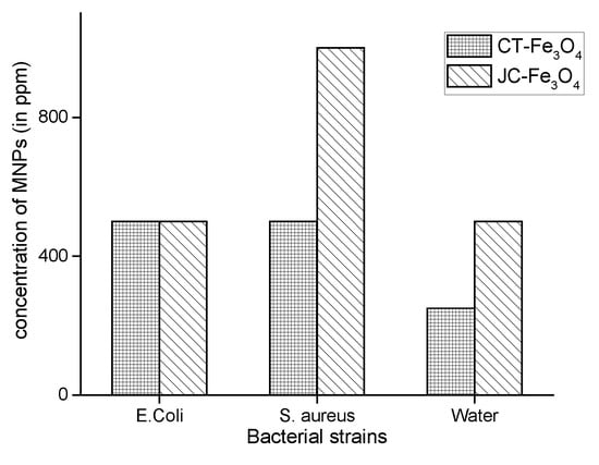 MIC of CT-Fe3O4 and JC-Fe3O4 NPs were determined by the broth dilution method using microliter-sized wells. The positive control sample contained 100 µL of bacteria inoculums with a culture medium in the absence of MNPs. The negative control contained 100 µL of culture medium in the absence of MNPs for monitoring sterility. Fifty microlitres of serially diluted CT-Fe3O4 and JC-Fe3O4 NPs were added to 10 columns containing 50 µL of culture medium (LB medium) to maintain the concentration sequence from 4000 ppm to 7.8 ppm. The standardized bacterial culture (1 × 105 cfu/mL) was added in each well from columns 1–10. Further, the microlitre-sized wells were incubated at 37 °C for 24 h, and the resulting turbidity was observed. The MIC was determined where there was no visible growth of bacteria detected. For further confirmation, the turbidity was measured by optical density readings at 600 nm with a UV-Vis spectrophotometer [47,48].