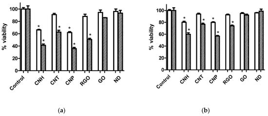 Cell viability assays after 24 h (white) and 72 h (striped) of incubation with various carbon nanomaterials at 3 µg·mL−1 showing differential effects on (a) Caco-2 and (b) MCF-7 cells. Values that are significantly different from the control (p < 0.05) are denoted with asterisk (*). Untreated cells were used as control.