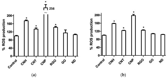 ROS generation on (a) Caco-2 and (b) MCF-7 cells upon incubation with nanomaterial dispersions (3 µg·mL−1) for 24 h. Significant results as compared to untreated control cells are marked by asterisk * for p-value < 0.05.