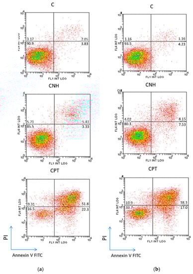 Annexin V/Propidium iodide assay, providing quantitative information about living (lower left quadrant), early apoptotic (lower right quadrant) and late apoptotic and necrotic (upper right quadrant) cells for (a) Caco-2 and (b) MCF-7 cell lines, treated with CNH at 3 µg·mL−1 for 72 h. Data are presented as percentage of the cell population. Untreated cells, denoted as C, were used as negative control, and CPT (0.8 µg·mL−1) treated cells were used as positive control.