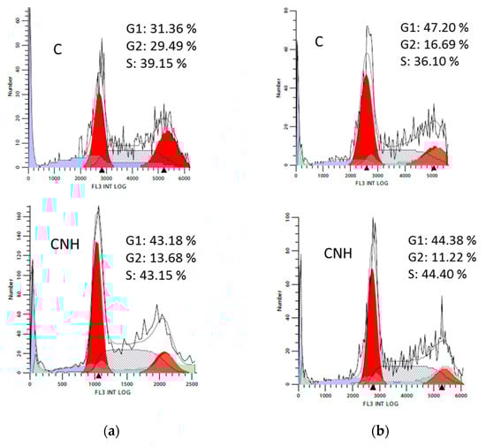 Flow cytometric analysis of (a) Caco-2 and (b) MCF-7 cell cycle after treatment with CNH at 3 µg·mL−1 for 72 h. C denotes untreated control cells.