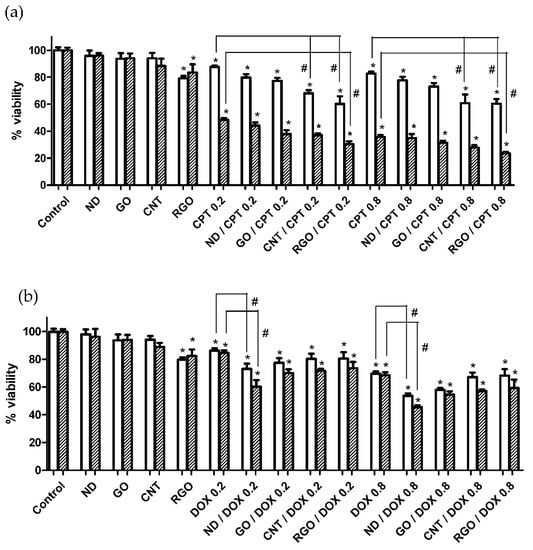 Cell viability assays after 24 h (white) and 72 h (striped) of incubation of Caco-2 cells with ND, GO, CNT and RGO at 0.6 µg·mL−1 concentration, free drug CPT (a) and DOX (b) at both 0.2 and 0.8 µg·mL−1 concentrations, and CPT- (a) and DOX- (b) loaded carbon nanomaterials. (* and # represent significance at p < 0.05 when compared to untreated control cells and free drug-treated cells, respectively).
