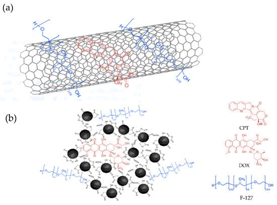 Schema of mechanism of interaction between drugs (in red) and carbon nanomaterials (in black): (a) CPT/CNT and (b) DOX/ND. (F-127 is depicted in blue).