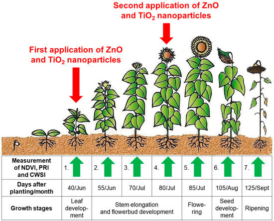 Schematic model of sunflower growth stages. While the red arrows indicate the foliar application of TiO2-NPs or ZnO-NPs, the green arrows indicate time intervals for measuring physiological parameters; normalised difference vegetation index (NDVI), photochemical reflectance index (PRI) and crop water stress index (CWSI) for the assessment of sunflower development.