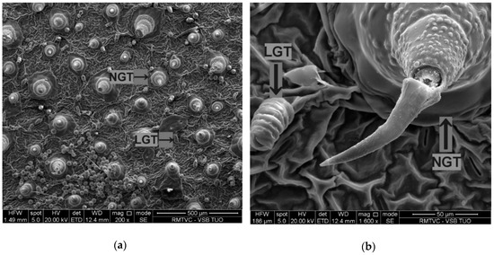 Representative scanning electron image of sunflower leaf surface with non-glandular trichomes (NGTs) and linear glandular trichomes (LGTs) in both NPs-treated variants and the control—(a) leaf surface, (b) trichome detail.