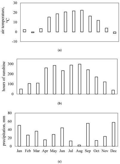 Monthly seasonal variations in the 2018 vegetation season at the Dolná Malanta experimental research field in Nitra in the Slovak Republic; (a) air temperature, (b) sunshine hours and (c) precipitation.