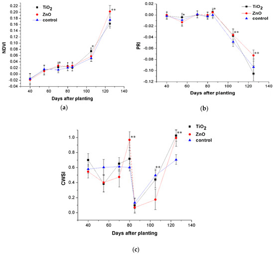 Analysed 2018 seasonal effects of sunflower foliar-sprayed titanium dioxide and zinc oxide nanoparticles variants associated with the following physiological indices and compared to the control; (a) normalised difference vegetation index (NDVI), (b) photochemical reflectance index (PRI) and (c) crop water stress index (CWSI), the significance: * P value < 0.05, ** P value < 0.01.