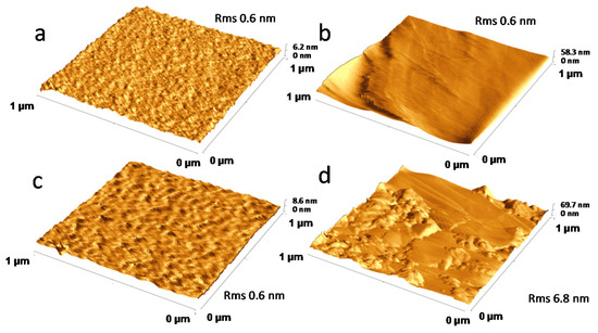 Atomic Force Microscopy images of (a) GP_naf_ex_Bi before bismuth electro-deposition; (b–d) GP_naf_ex_Bi after bismuth electro-deposition in three different representative regions.