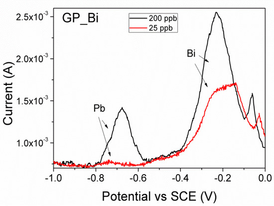 Figure 4 reports typical square wave anodic stripping voltammograms obtained by GP_Bi of Pb2+ at concentrations of 25 (red line) and 200 (black line) ppb, respectively. The voltammograms show two peaks centered at about −0.67 and −0.22 V vs. SCE that are assigned to Pb2+ and Bi3+, respectively [14]. The anodic stripping peak corresponding to Bi3+ is typically broad and exhibits asymmetry which may be attributed to different Bi phases, structures, or partial bismuth oxidation. The smaller peak observed at about −0.05 V vs. SCE can be assigned to BiOx. Broad Bi peak was observed by Zhao using a double Bi deposition technique and MWCNT–Nafion/glassy carbon electrode [14]. The peak of Pb2+ at concentration of 25 ppb is slightly shifted, in comparison to 200 ppb sample, centered at about −0.73 V.