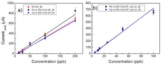 Afterwards, we considered the case of simultaneous detection of cadmium and lead. Figure 5a shows the anodic stripping voltammograms in the potential range from −1.2 to 0.1 V vs. SCE of simultaneous detection of Pb2+ 200 ppb and Cd2+ 200 ppb by GP_Bi (red line), GP_naf_Bi (blue line) and GP_naf_ex_Bi (black line) electrodes, respectively. Voltammograms show well-defined, intense and resolved peaks corresponding to Cd2+, Pb2+ and Bi3+.